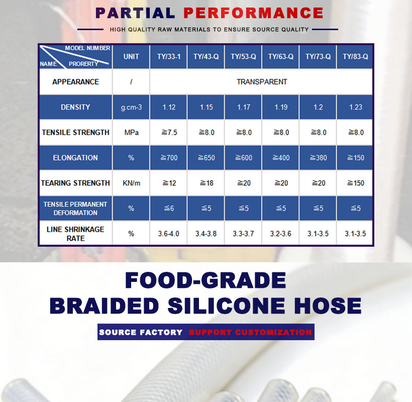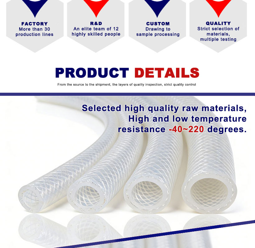 Advanced Food-Grade Craft: Adopt platinum-catalyzed vulcanization technology for low odor and zero harmful substances. High-strength food-safe fiber braiding ensures pressure resistance, dimensional tolerance controlled within ±0.5mm, complying with USP Class VI standards.